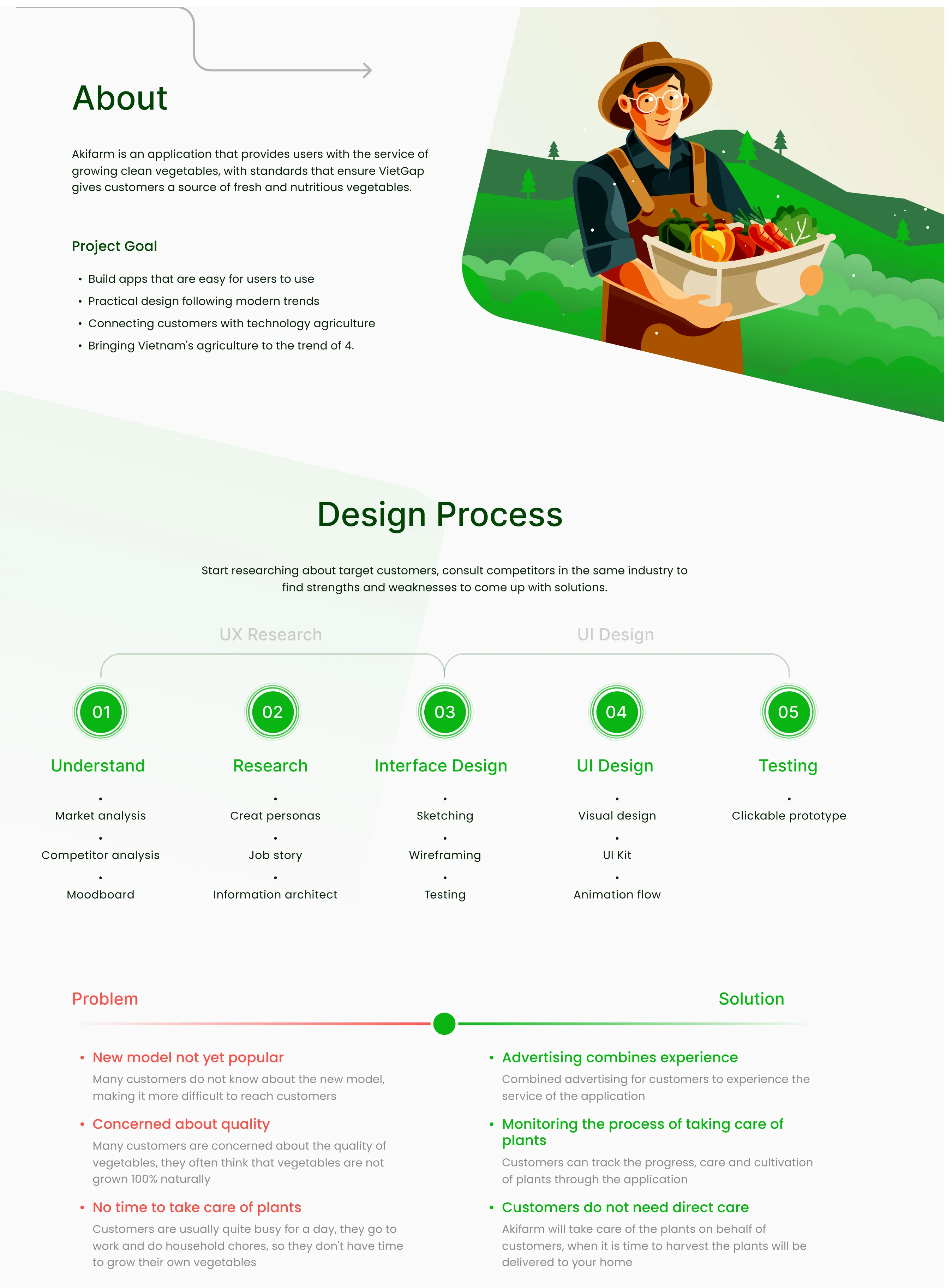 - Mô tả: Akifarm cung cấp dịch vụ trồng rau-củ-quả theo yêu cầu. Bạn được lựa chọn loại rau-củ-quả theo mùa vụ và đội ngũ nhân sự tại Akifarm sẽ trồng thay bạn dưới sự theo dõi, giám sát trên tiêu chuẩn trồng trọt VietGAP (11892-1:2017) và HACCP. Đến kỳ thu hoạch bạn đến nông trại Akifarm lấy về hoặc chúng tôi sẽ mang tới nhà bạn.